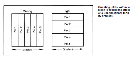 การวางแนวแปลงและบล็อกที่ถูกต้อง: จัดวางบล็อกให้ความแตกต่างระหว่างบล็อกมีค่าสูงสุด และแปลงภายในบล็อกมีความสม่ำเสมอมากที่สุด (วางแนวแปลงด้านยาวไปตามทิศทางที่มีความแปรปรวนสูงสุดภายในบล็อก)