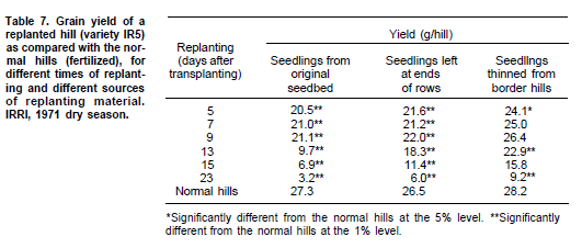 ไม่ว่าจะทำการปลูกซ่อมเมื่อใดหรือใช้ต้นกล้าประเภทใด กอที่ปลูกซ่อมจะเจริญเติบโตแตกต่างจากกอปรกติเสมอ ผลผลิตเมล็ดของกอที่ปลูกซ่อมจะต่ำกว่ากอปรกติ แม้ว่าจะทำการปลูกซ่อมเร็วเพียง 5 วันหลังการปักดำก็ตาม และยิ่งปลูกซ่อมช้าลงเท่าใด ผลผลิตก็จะยิ่งลดลงมากขึ้นเท่านั้น เพื่อผลลัพธ์ที่ดีที่สุด แนะนำให้ใช้ต้นกล้าที่ถอนแบ่ง (thinned) มาจากกอแถวขอบ มากกว่าการใช้ต้นกล้าจากแปลงกล้าเดิมซึ่งจะให้ผลลัพธ์ที่แย่กว่า